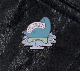 Cute enamel 'Beleive in Yourself' plesiosaur badge. Push through pin fastener.